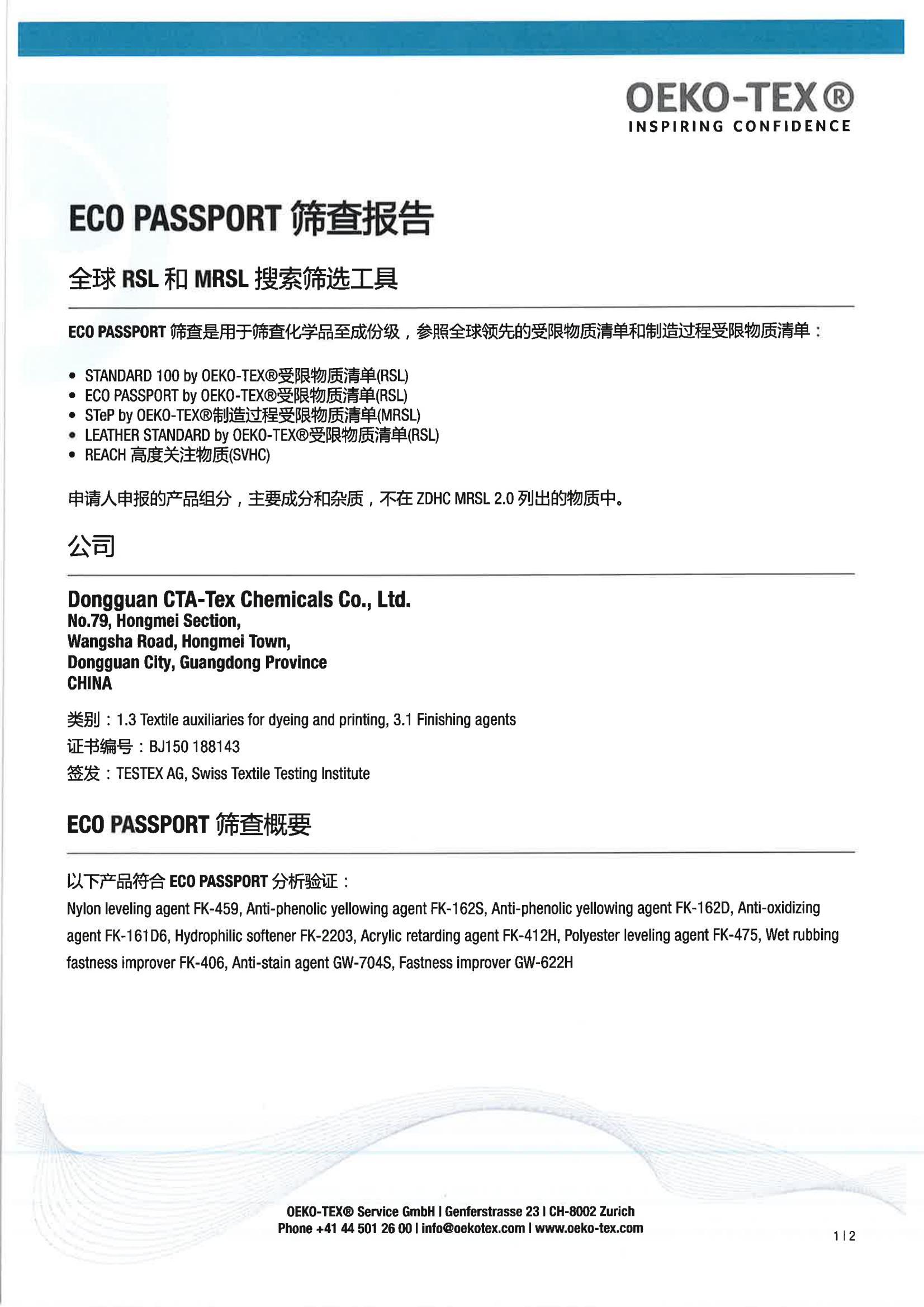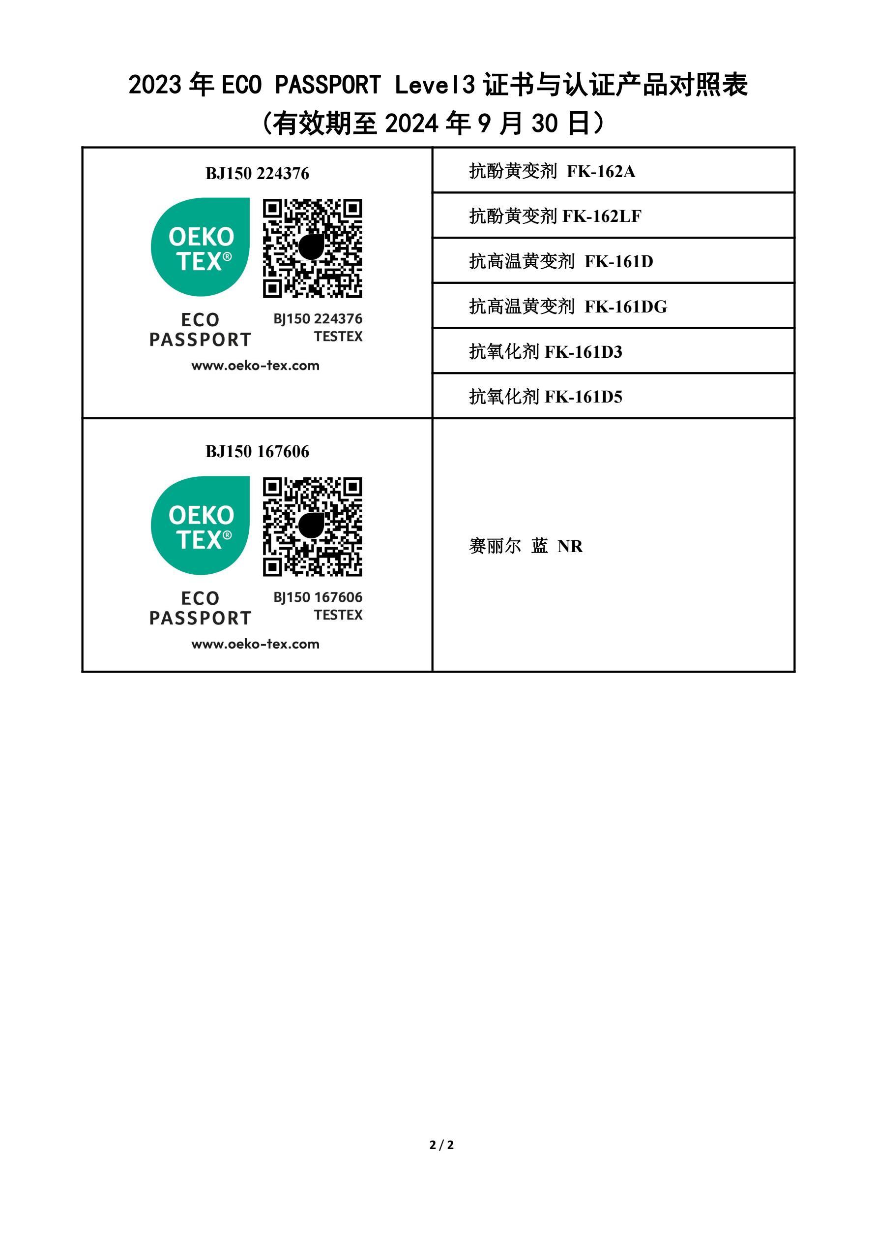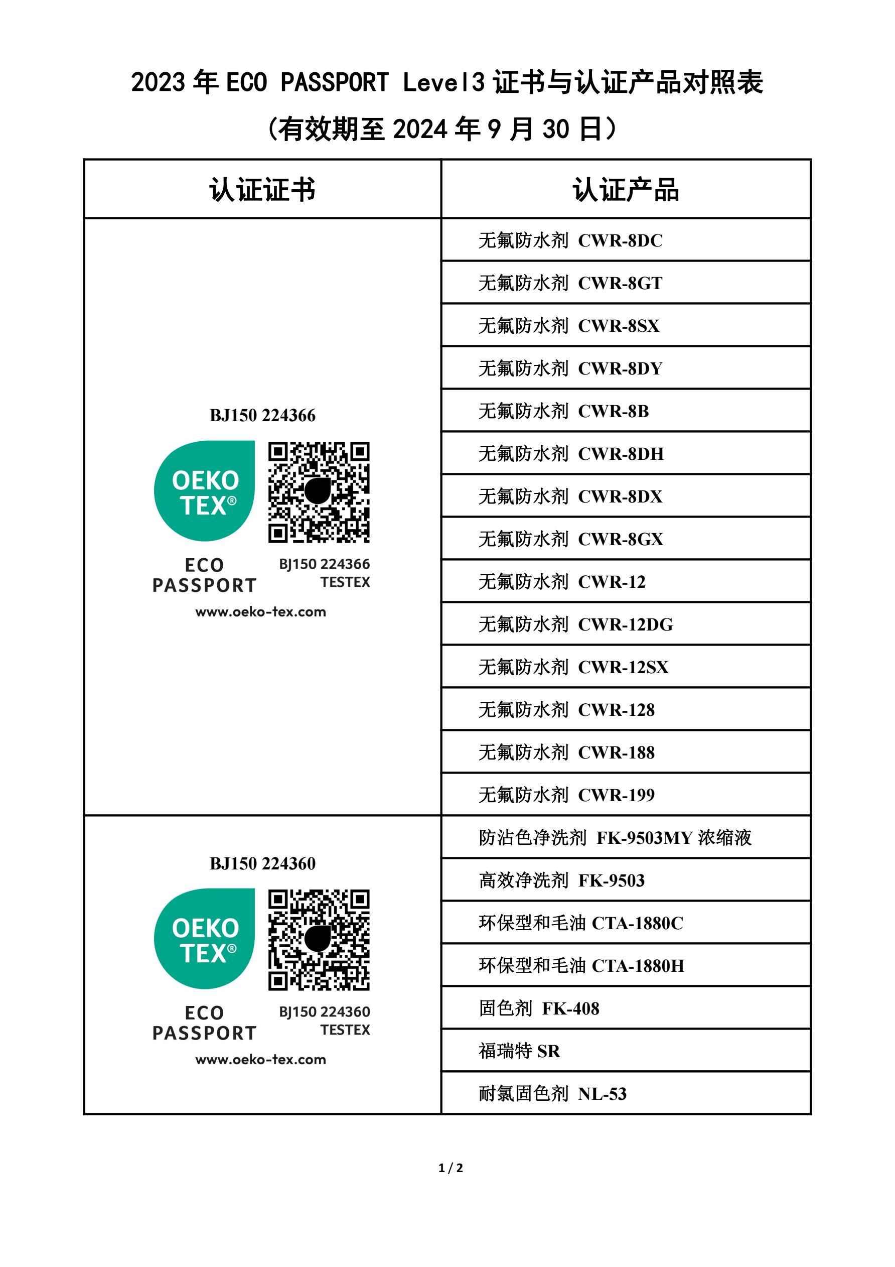 2023 ECO PASSPORT证书与认证产品对照表