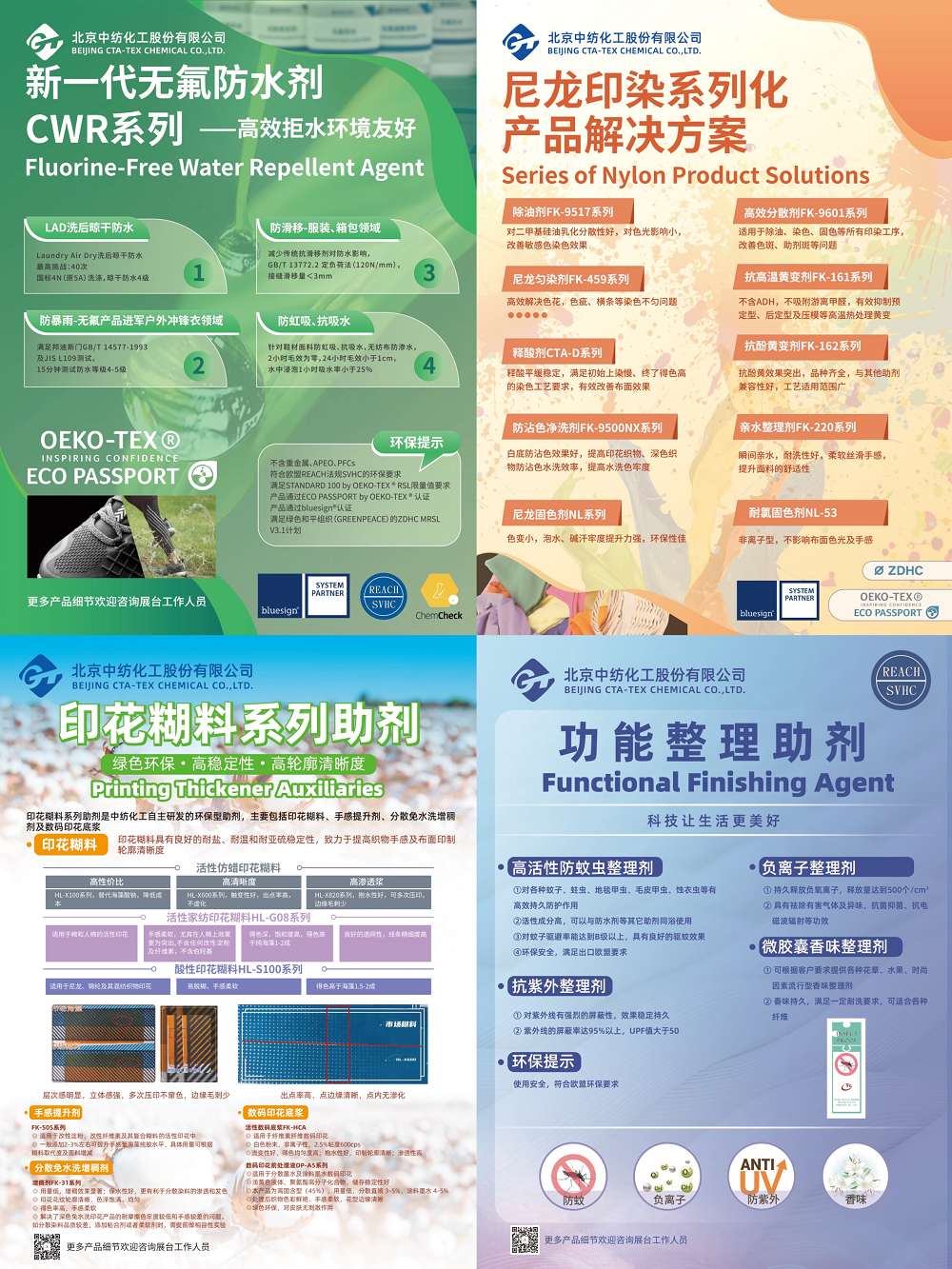 中纺化工积极践行“以科技进步和品质服务引领美好生活”的企业使命,牢牢把握高质量发展主题,充分发挥科技创新引领和赋能作用,突出“客户至上”“品质第一”的基本理念,持续提升自主研发实力和科研成果转化能力。近年来,专注于开发符合bluesign®、ECO PASSPORT by OEKO-TEX®、ZDHC和GOTS等国际环保标准的环保产品,积极推动行业的技术革新与可持续发展,以新质生产力推进企业高质量发展。
