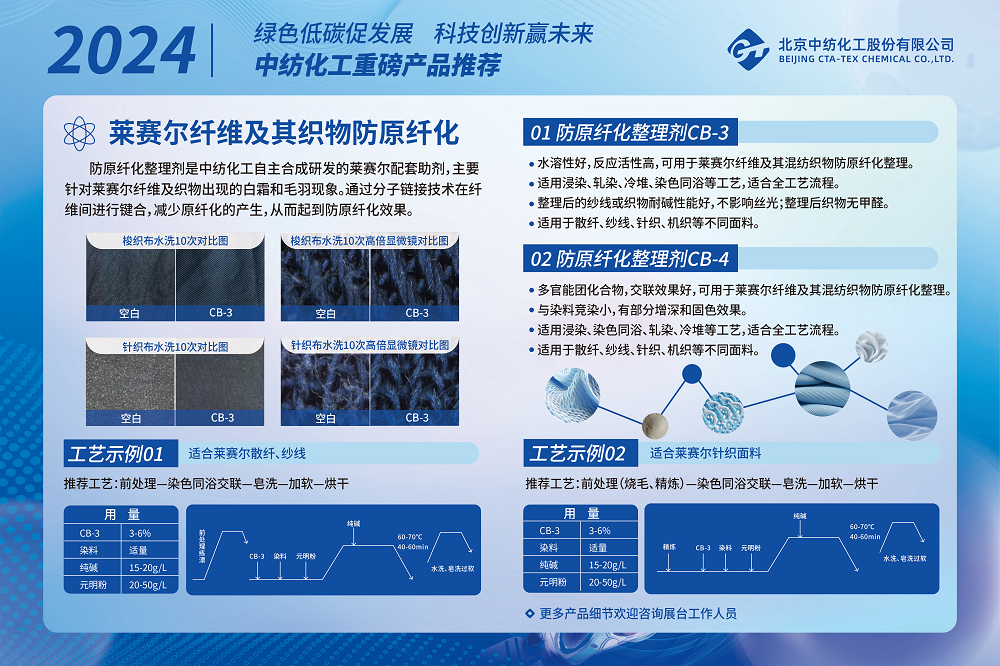 展会上中纺化工携无氟防水剂、高端尼龙系列助剂、莱赛尔纤维助剂、印花糊料及多功能整理剂等产品实力亮相,产品立足企业技术攻关需求,聚焦最新创新成果,展示了以科技赋能行业发展的强劲动力。